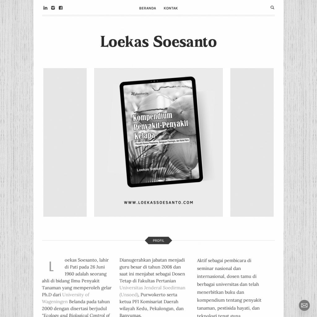 Pak Prof yang kami maksud adalah beliau Prof. Ir. Loekas Soesanto, M.S., Ph.D. yang merupakan dosen tetap sekaligus guru besar dari Fakultas Pertanian Universitas Jenderal Soedirman (UNSOED). Kami salah satu alumni yang pernah dibimbing beliau memberikan hadiah kecil berupa website untuk mendokumentasikan hasil karya yaitu buku-buku bidang keahlian beliau. Website tersebut adalah www.loekassoesanto.com yang tentu dibuat dari platform WordPress.